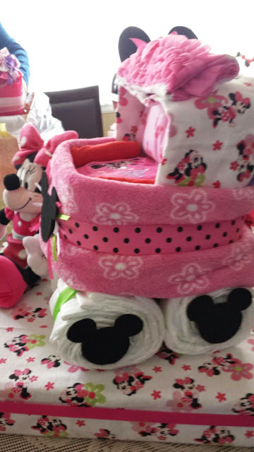 My cousin is having a baby shower and I wanted to make something special. Of course it had to have a little Minnie Mouse touch to it. I've seen all kinds of cute shower gifts on Pinterest and thought I would attempt to make something different. I made a stroller our of blankets, bibs, and even added a cute little Minnie Mouse stuffy. Here it is!