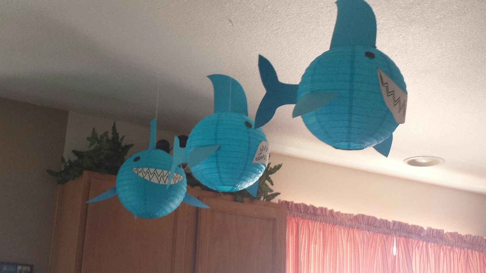 Shark Week has been a big deal in my house for the last few years. It started out as a way to show my 26 year old son that I loved the "kid" in him and that he still loved watching educational programming. So, I started giving little silly gifts like bath toys, socks, and candy. It has grown so big now, that I actually spend two days decorating my house for this unique week, just for my son! This year, most of the gifts came in the form of decorations, but I still managed to give him something "sharky" everyday too! Here's what my house looks like. I gave him a new Shark comforter set for the last day of Shark Week (day 7).